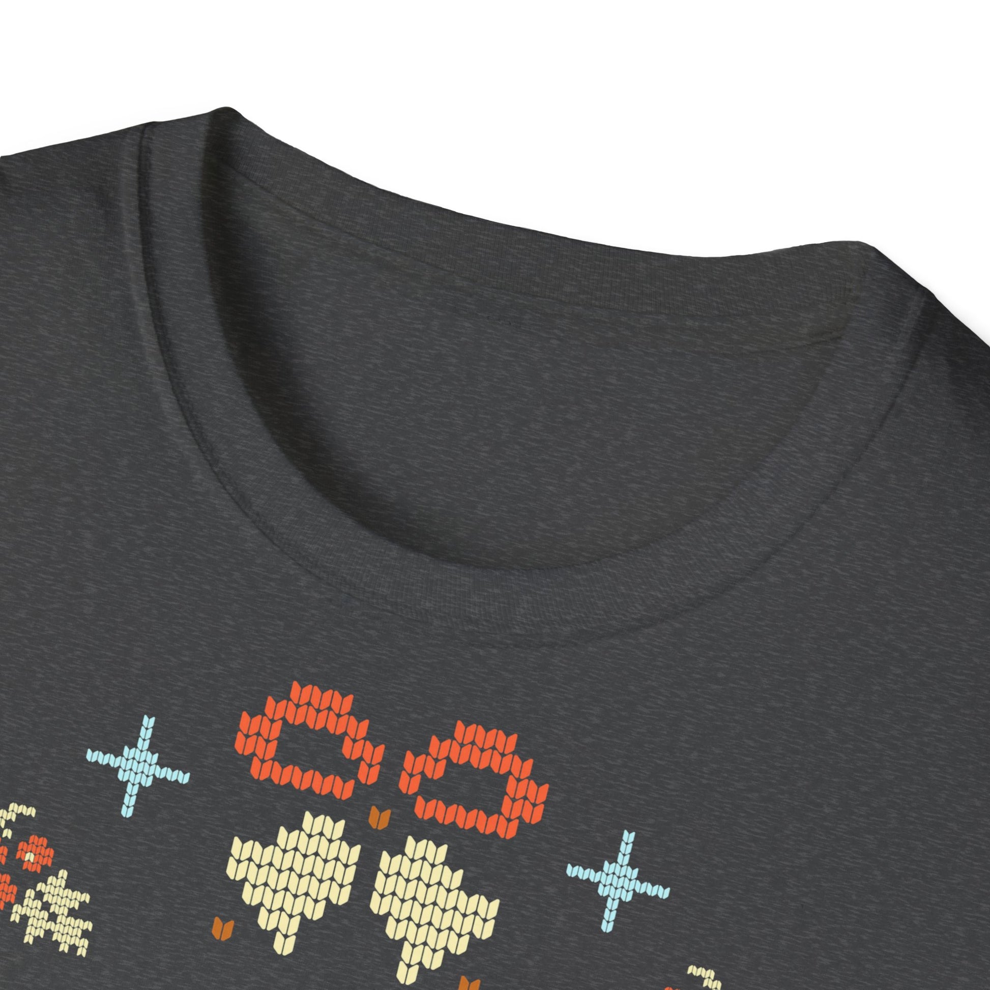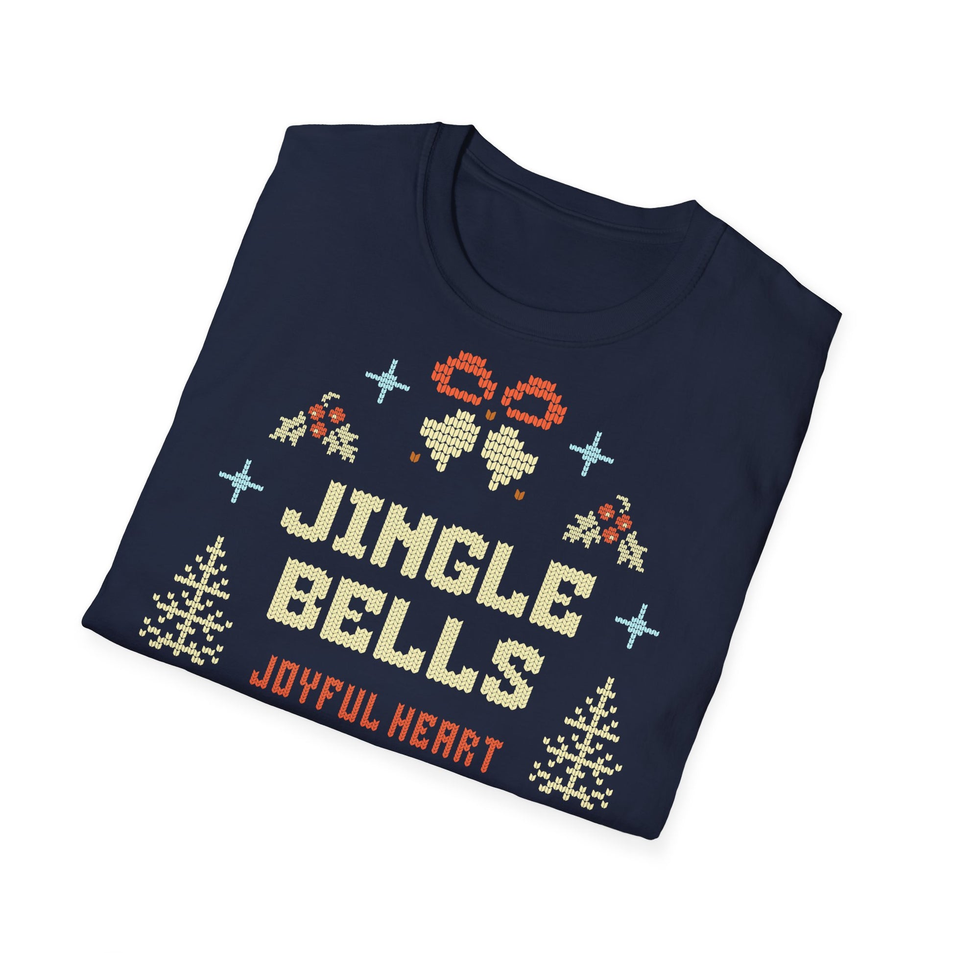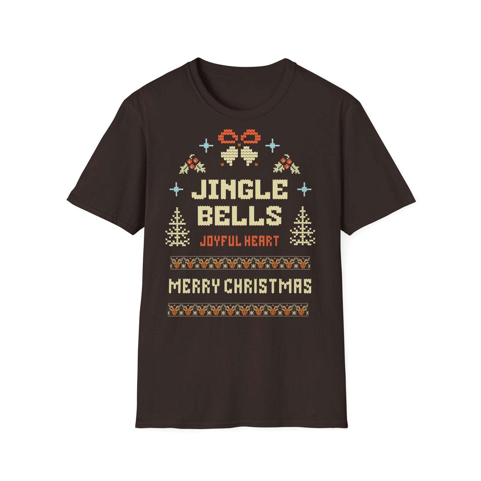 This image depicts a festive cross-stitch style graphic celebrating the Christmas season, featuring the text "JINGLE BELLS" and "MERRY CHRISTMAS" crafted in a knitted pixel art design. Surrounding the text are decorative elements typical of holiday crafts, including stylized evergreen trees, snowflakes, and geometric shapes. The artwork is created to resemble an embroidered or knitted pattern, with each letter and design element carefully constructed to look like it's made from interlocking stitches. Cute reindeer motifs line the top and bottom borders, adding to the holiday cheer of the composition. The overall design evokes the warmth and nostalgia of traditional holiday crafts, capturing the spirit of "Joyful Heart" as noted in the smaller text.